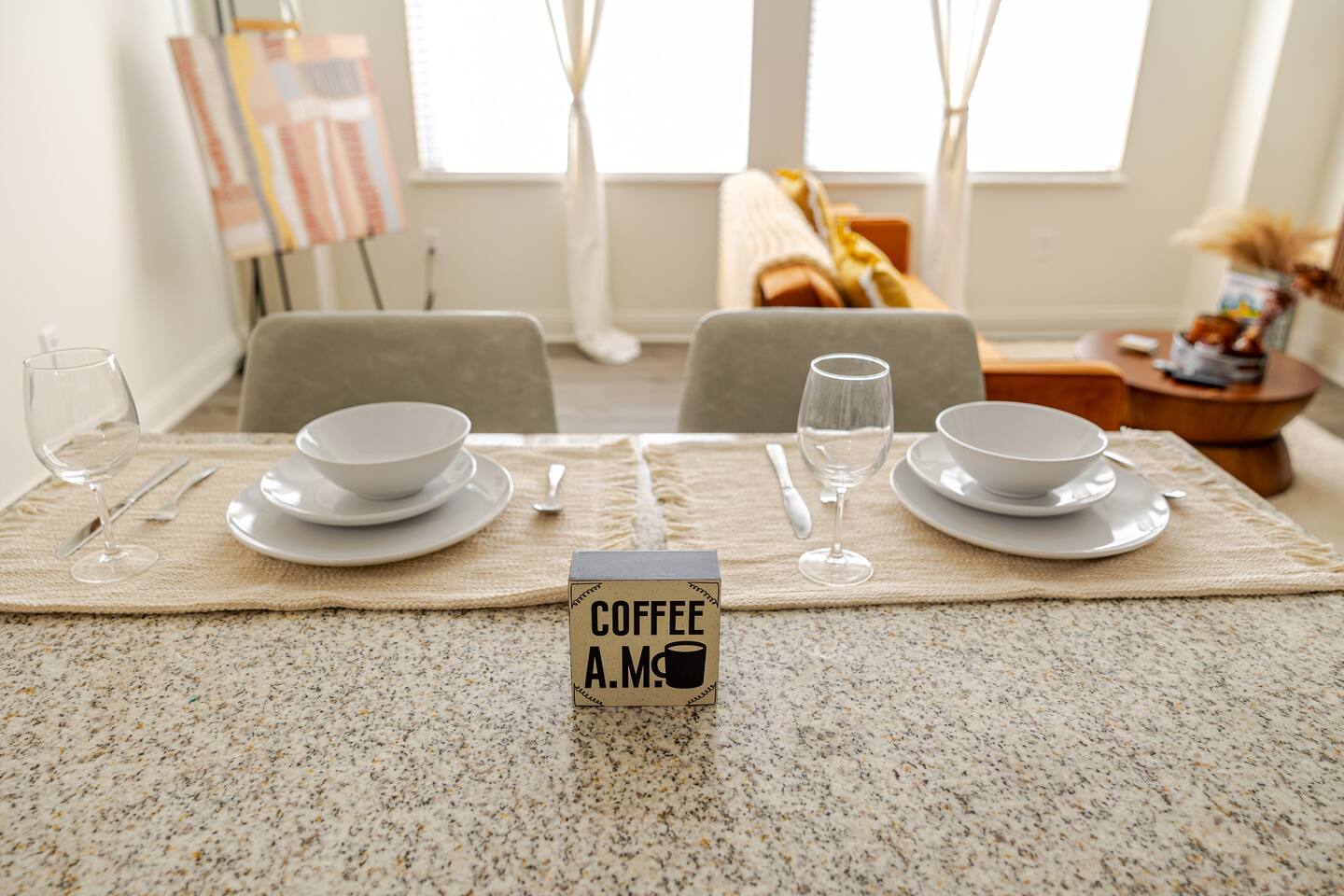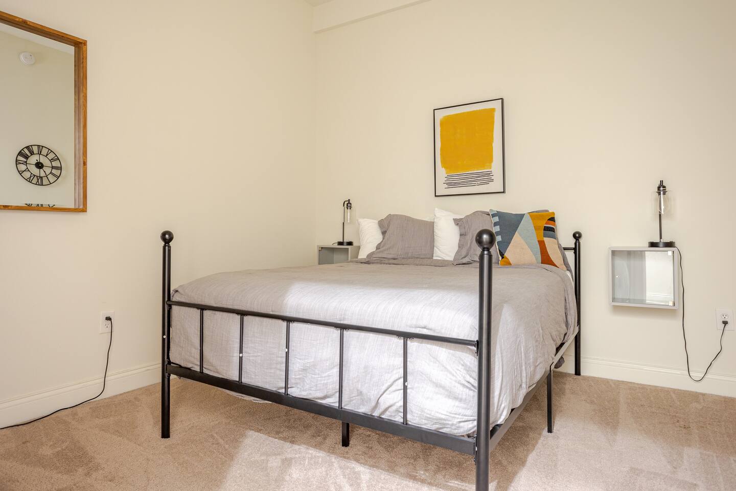 There is a queen bed located in the bedroom. In the living room there is a couch that converts into a full size sleeper. There are legs that fold out from behind the couch cushions that fold out to support the back once folded down.