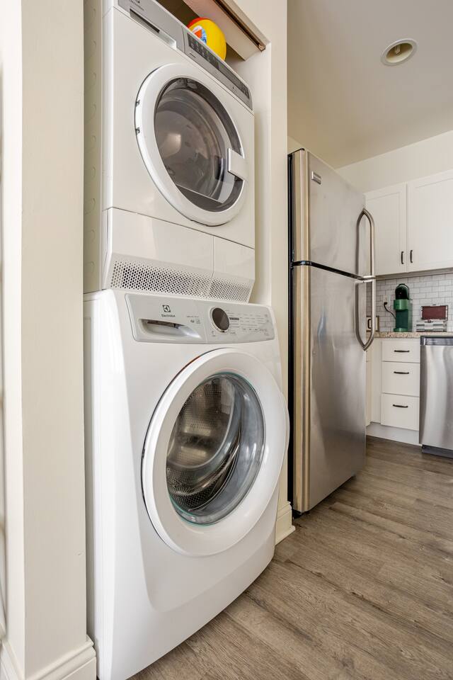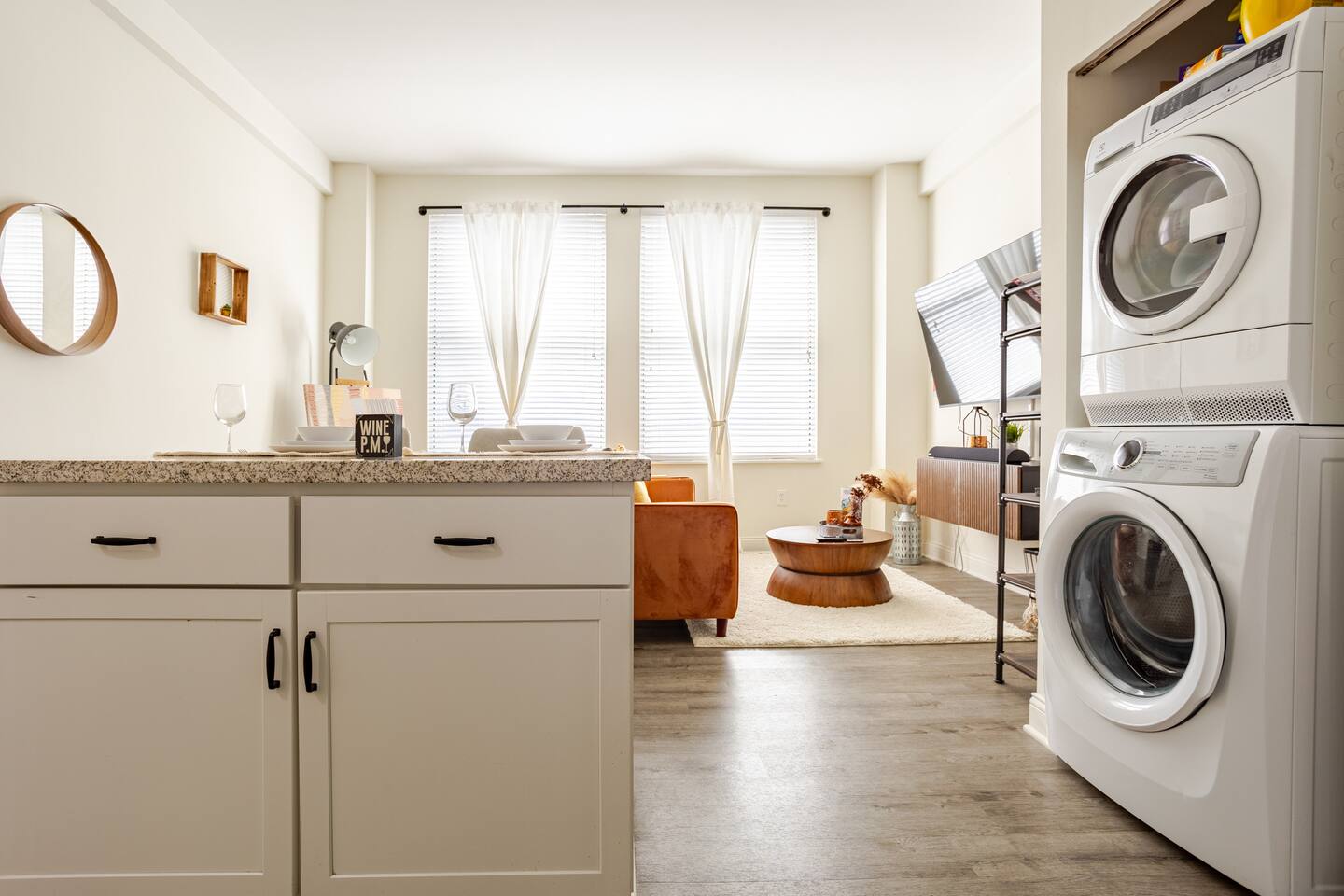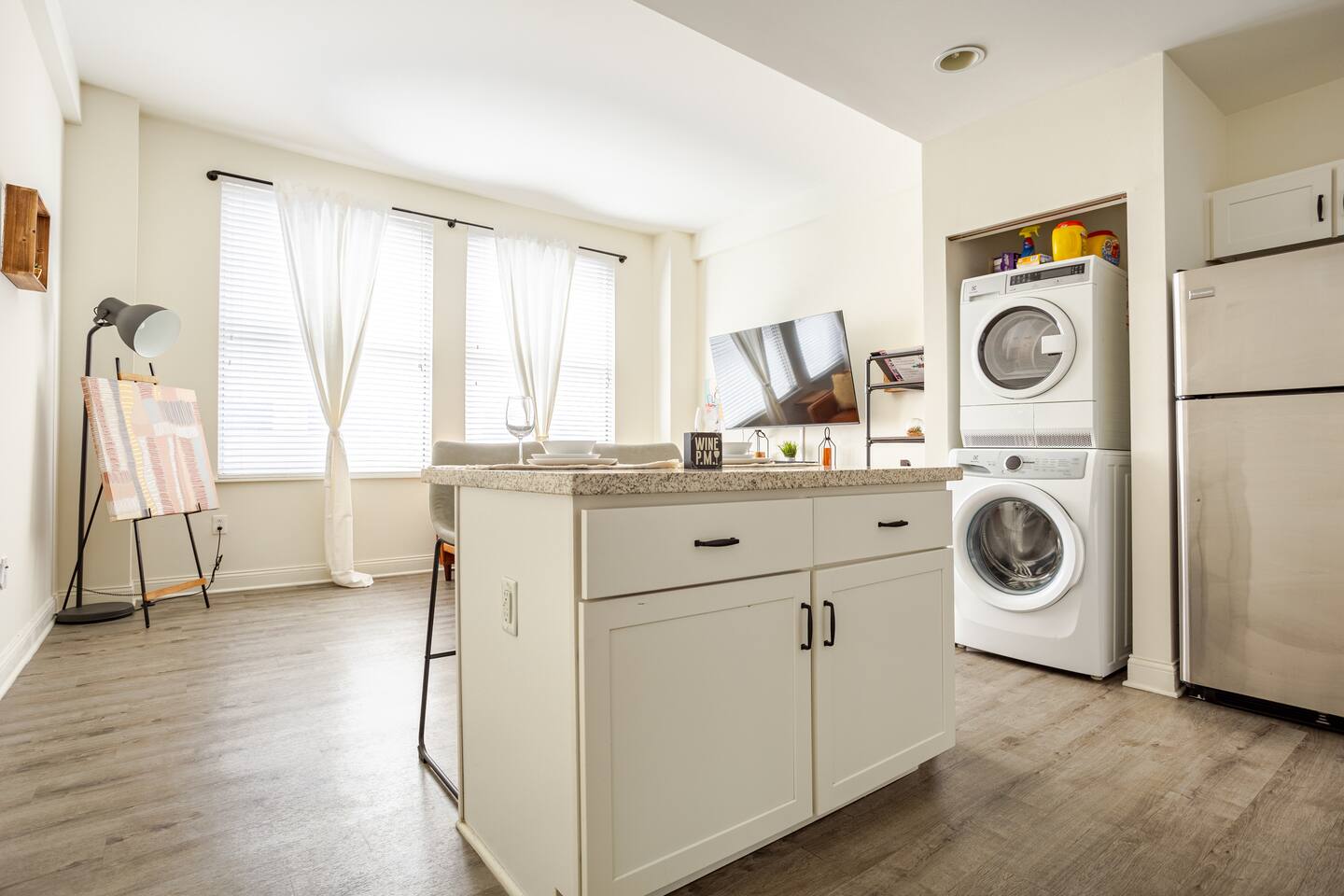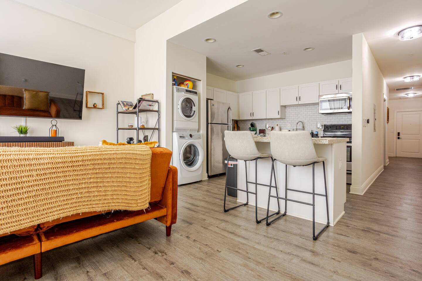 This is a one bedroom apartment with a full kitchen, washer and dryer, bathroom and living room.